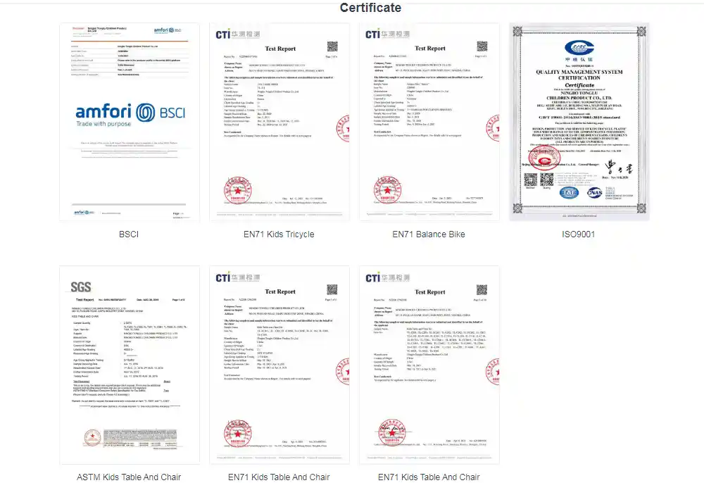 Certifikati, kot nprEN71inASTMkažejo, da je našotroški in malčki trikolesnik za je prestala specializirane teste v smislu, ali so materiali nestrupeni, ali bodo vogali rezali roke in ali so deli trdni ter izpolnjuje varnostne standarde.